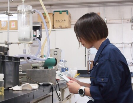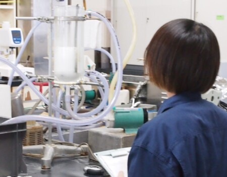 工場で発生する泡を消す薬剤である消泡剤の選定・開発や、家庭で使う日用雑貨の開発等が主な業務です。ほかにも繊維用平滑剤の開発や水処理施設で使われる分散剤の選定など、お客様からの要望に沿って幅広い分野での分析・研究開発を行なっています。